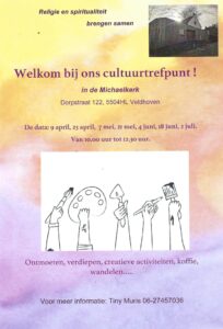 In samenspraak met de gemeente Veldhoven: Kijken of we als kerk met een open deur naar onze directe omgeving ontmoeting, verdieping en creativiteit kunnen bieden. Wij hebben tot de zomer een aantal ochtenden gepland die ook in de plaatselijke krant worden aangekondigd. Vanuit de rijke cultuur in onze Christengemeenschap willen we graag samen werken en delen met anderen.